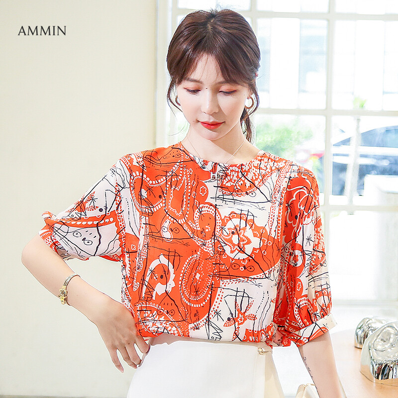 AMMIN Tops Short-sleeved round neck abstract printed chiffon shirt women's 2021 new style middle-sleeved loose-fitting casual western-style plus size blouse