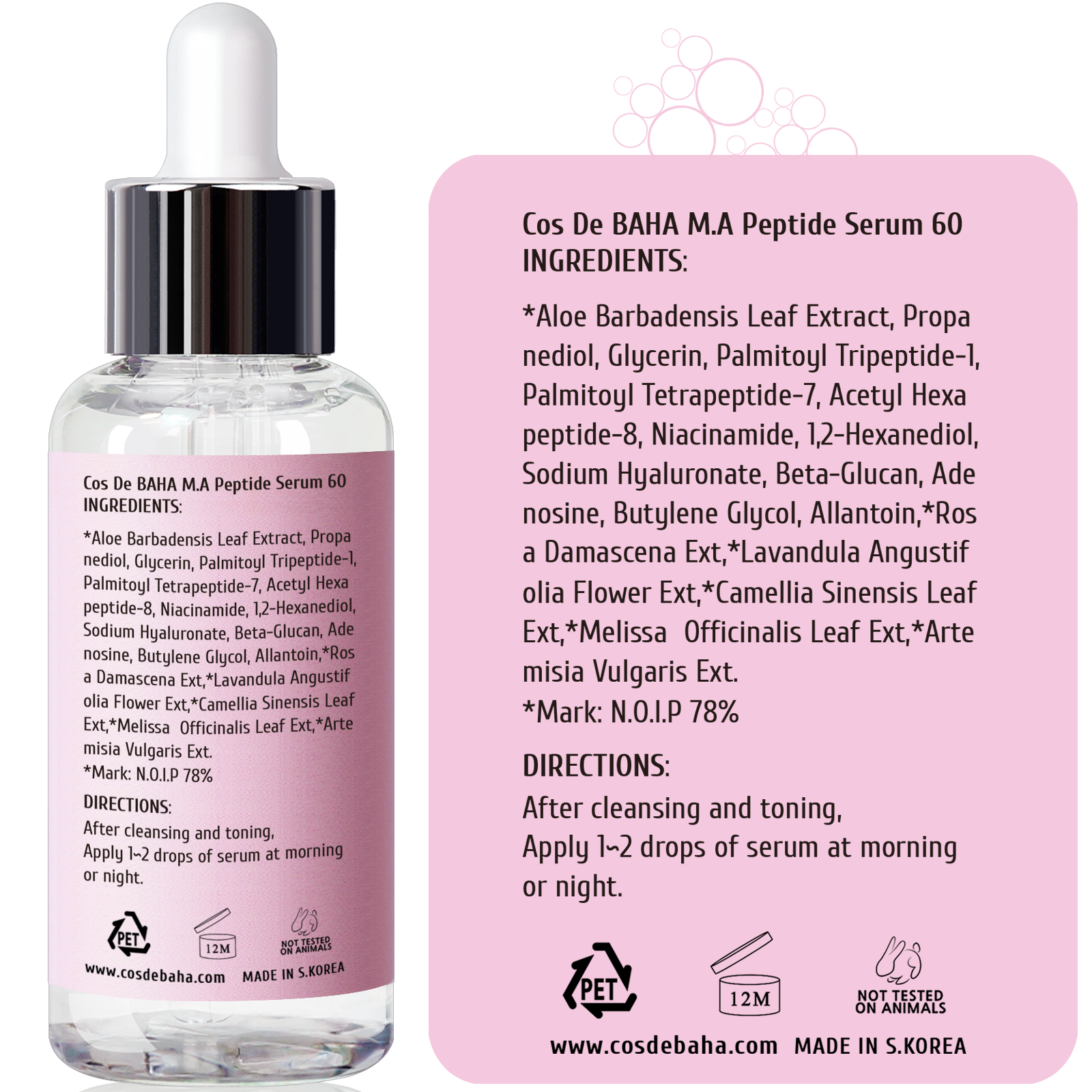 Anti-aging products are no longer only for specific age groups. Now it's safe to say that the products that have the effect of improving wrinkles are who want to take care of their skin before it gets wrinkled, as well as those who are wondering how to manage the wrinkles that they already have. If you're looking for a more satisfying, safe-use anti-aging serum, Cos De BAHA's M.A.Peptide serum will be the answer. Using only proven safety materials, this serum allows the benefits of the Matrixyl 3000 and Argyline to be revealed in your life. If you're thinking about what kind of serum to use now, meet Cos De BAHA so your skin can have a healthier day right now.