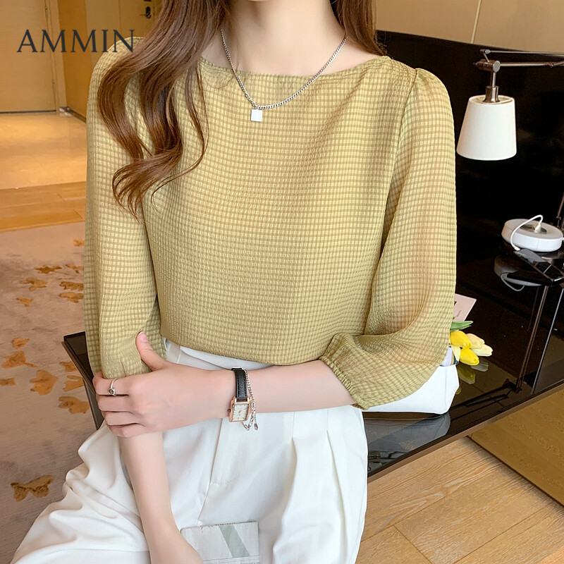 AMMIN 2021 New Summer Three-quarter Sleeve Fashion Loose Chiffon Top For Lady One-word Neck Loose Lantern Sleeves Plaid Chiffon Top Casual Blouse