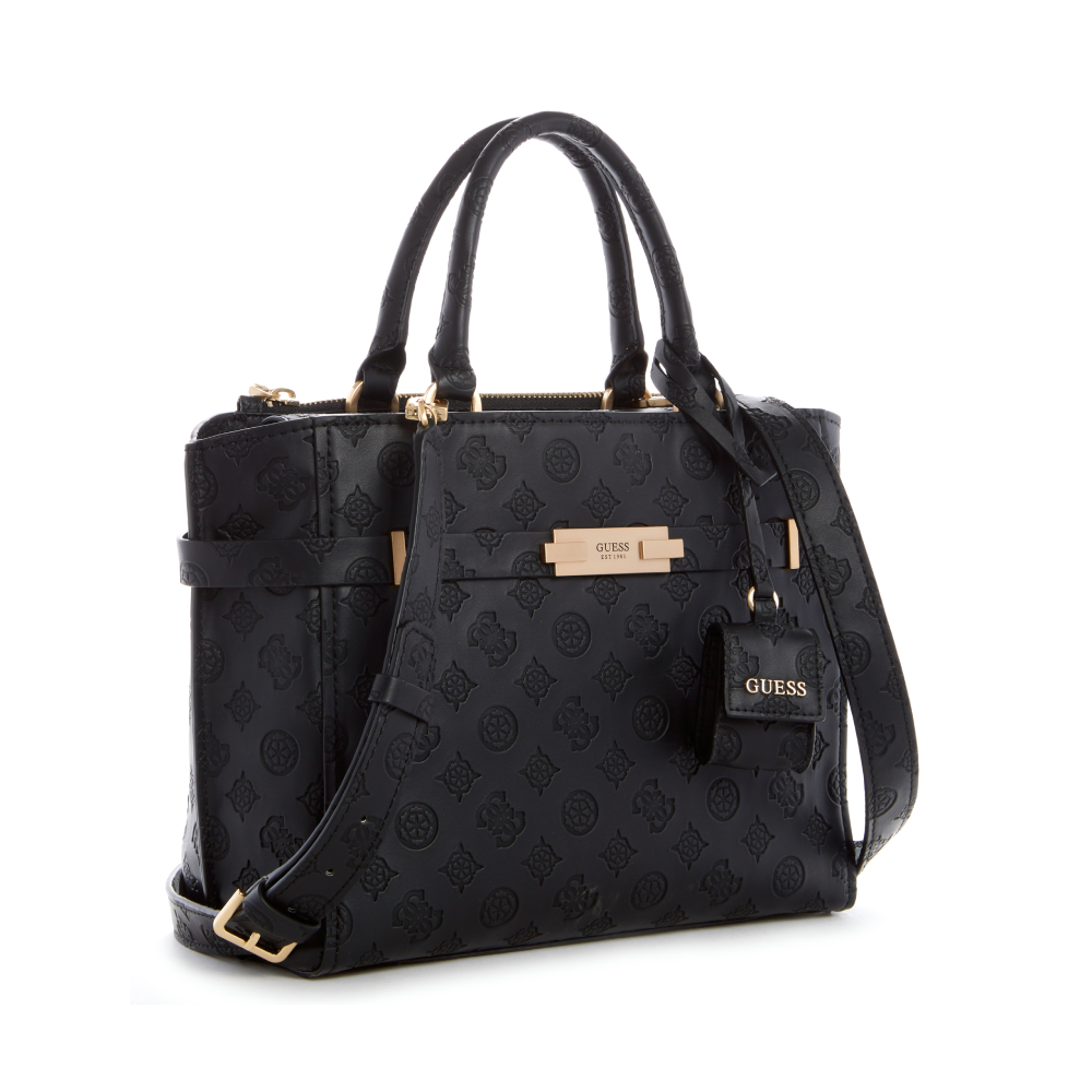 This versatile satchel is structured with a divided interior with belted logo emblem at front and detachable crossbody strap.