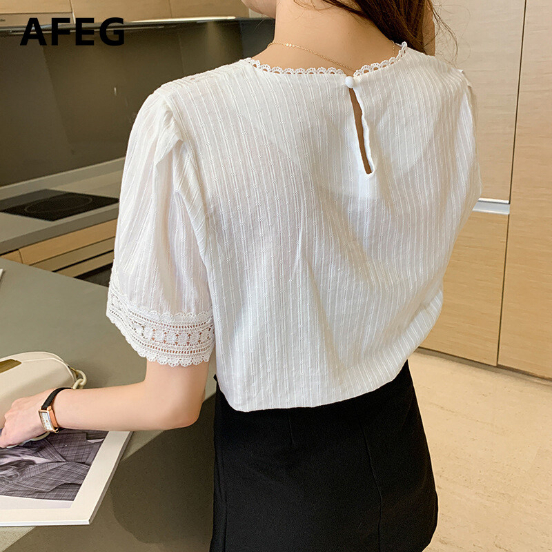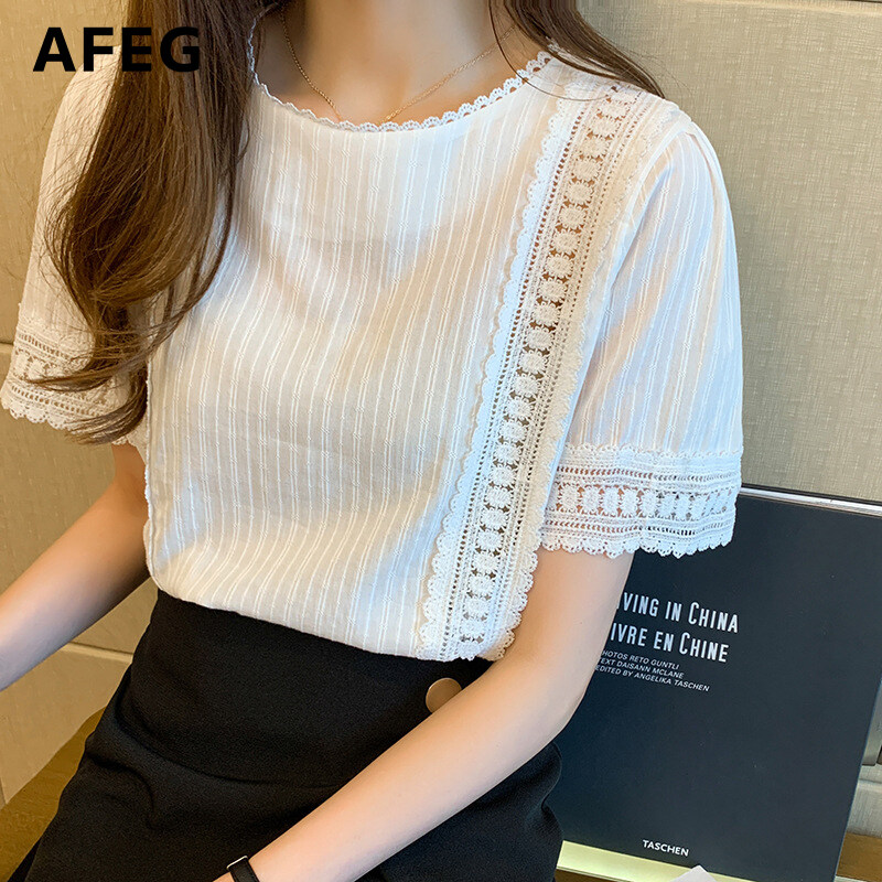 AFEG new Korean round neck fashion loose and versatile hollow stitching short-sleeved blouse for women