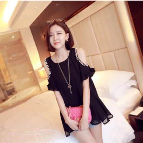 EDQRDQ Off Shoulder Plus Size Loose Tops for Women Ruffle Trim Short Sleeve Blouse Casual Chiffon Shirt
