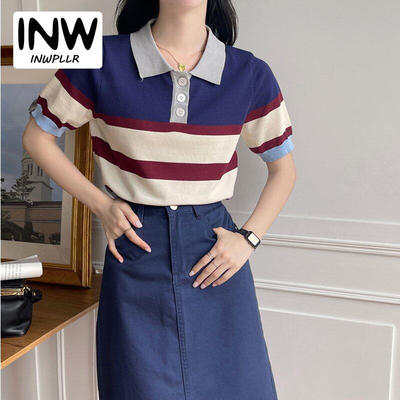 INWPLLR Pretty Navy Neck Chic Tops Women's Western Style Striped T-Shirts Leisure Fashion Short-sleeves T-shirts Lady