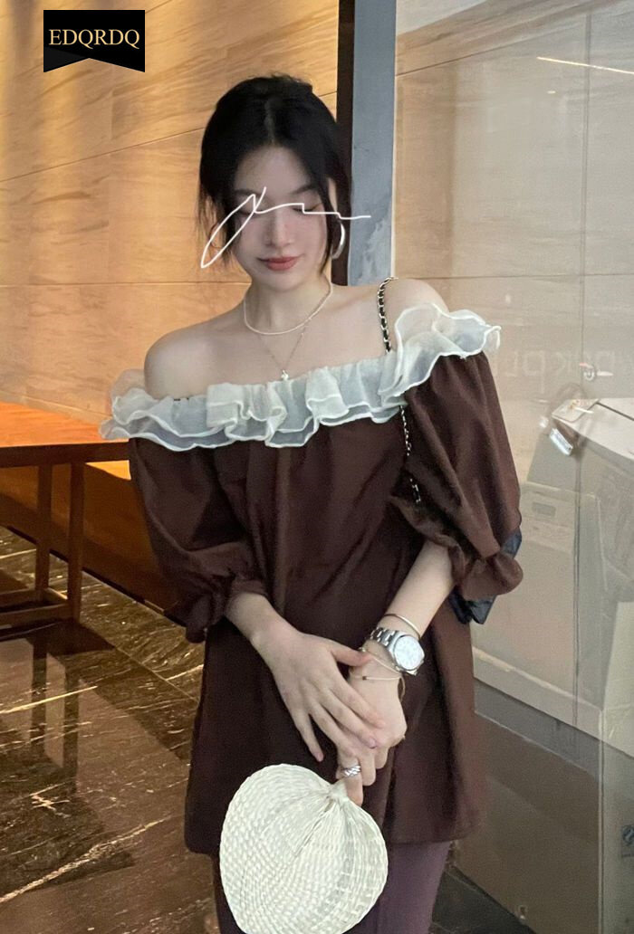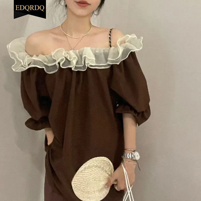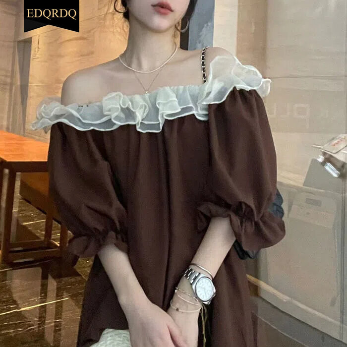 EDQRDQ Women's Off The Shoulder Tops Casual 3/4 Sleeve Blouse Solid Shirts Sexy Ruffle Trim Tunic Tops