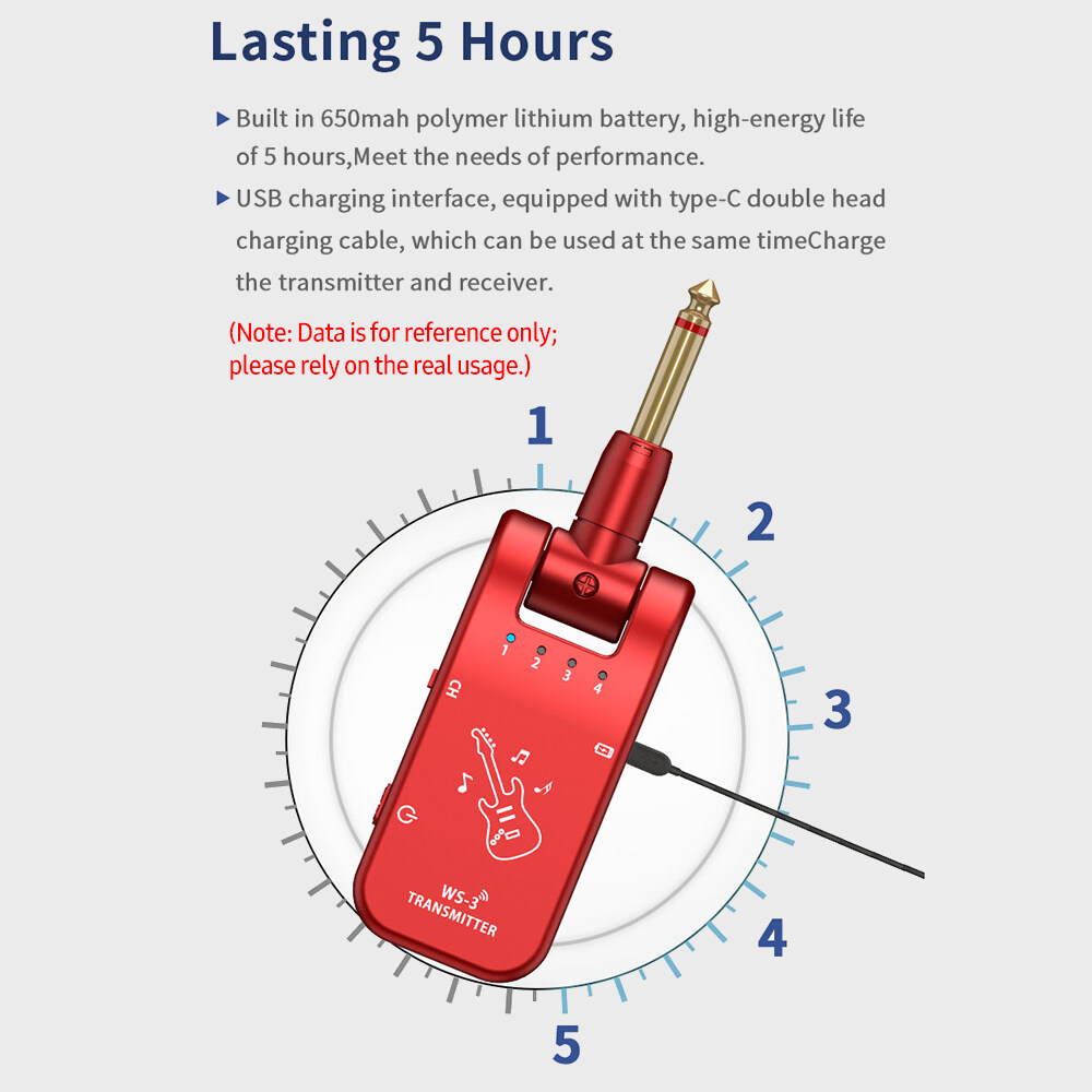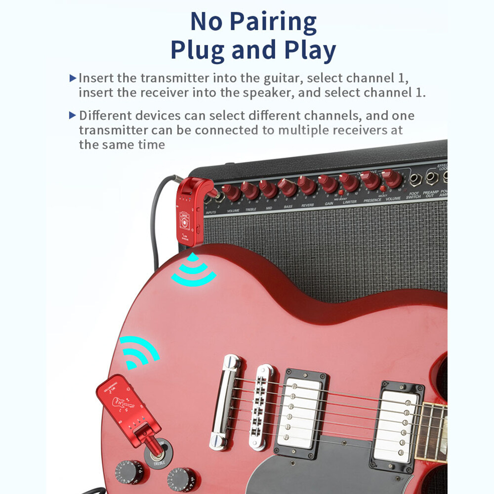 wireless audio system designed for electric musical instruments. The transmission frequency band is 800MHz-900MHz, the transmission range is 50m barrier-free and 30m through the wall. With ultra low delay, original sound quality transmission, strong anti-interference, 282-degree rotation 6.35mm audio interface, built-in rechargeable