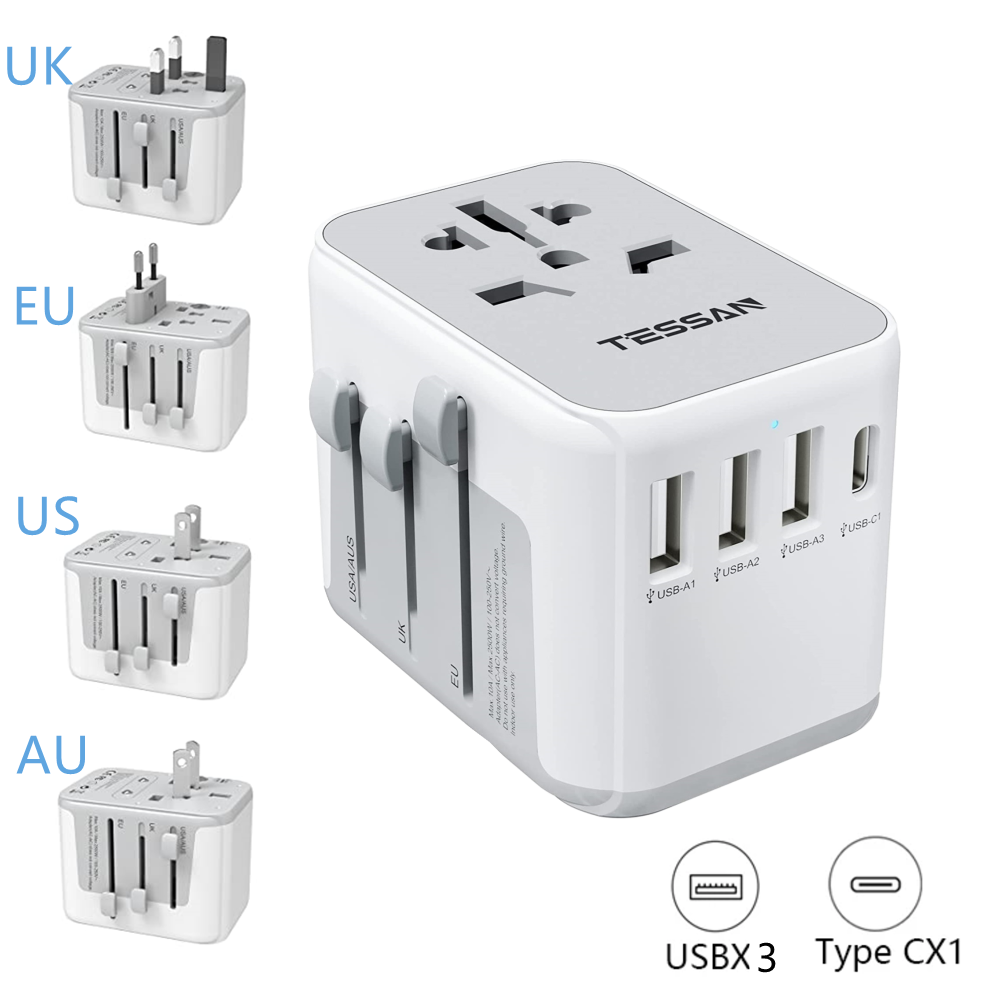 Universal Adapter Plug PH/US/AU/EU Adaptor Socket Travel Charger with 3 USB Ports+(1 USB C),TESSAN International Travel Adapter Universal Adaptor All in One Worldwide EU Adaptor Universal Socket for E