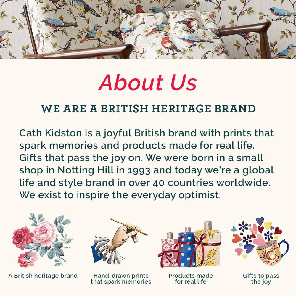Cath Kidston is a joyful British brand with prints that spark memories and products made for real life. Gifts that pass the joy on. We were born in a small shop in Notting Hill in 1993 and today we're a global life and style brand in over 40 countries worldwide. We exist to inspire the everyday optimist.
