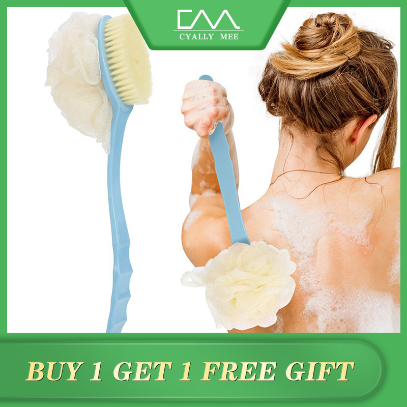 CYALLY MEE Long Handle Soft Hair Bath Brush Sunwuun Back Scrubber Body Brush Loofah Dry Brushing Body Brush With Handle For Shower With Loofah, 2-in-1 Multifunction Bath Brush Mesh Sponge With Curved