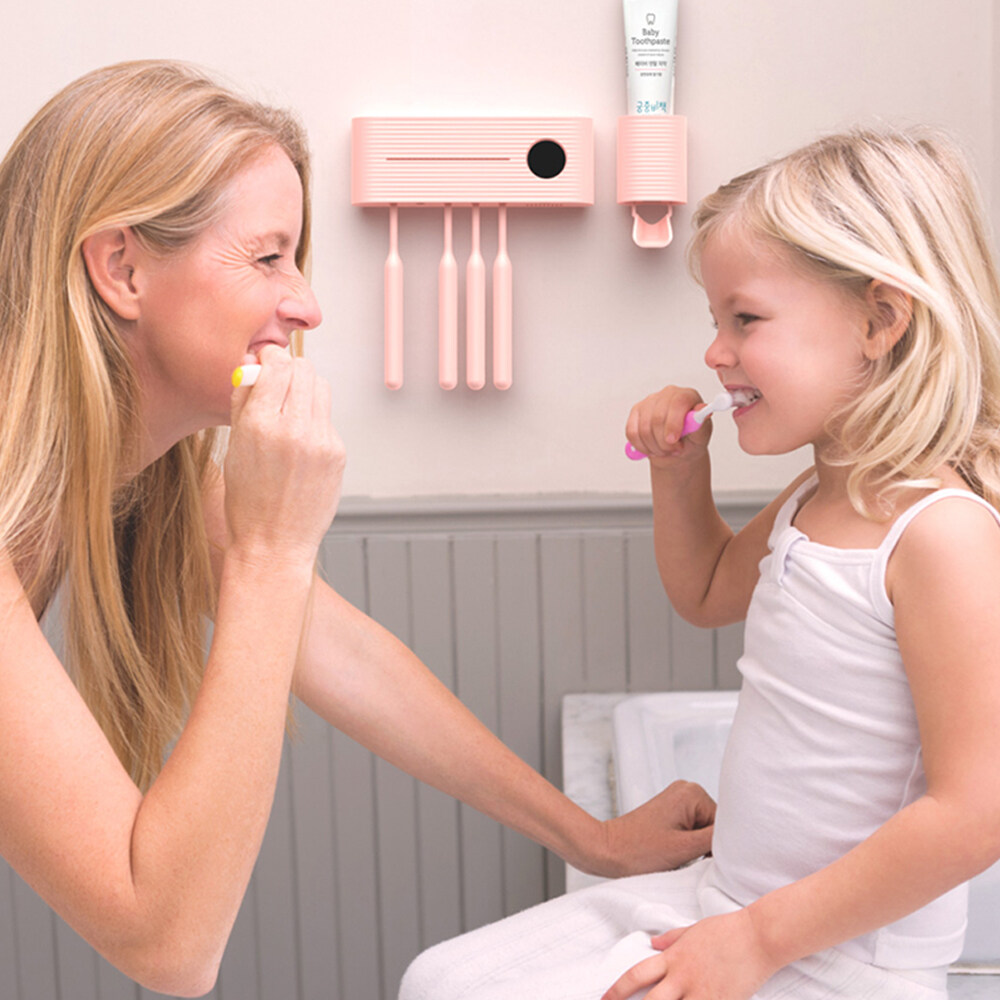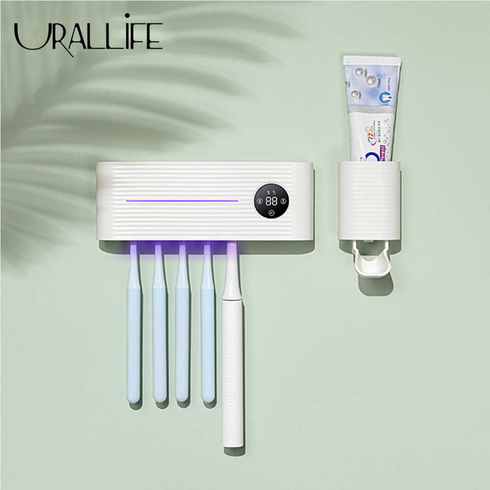 URALLIFE 2 in 1 UV Light Ultraviolet Toothbrush Sterilizer with Automatic Toothpaste Squeezers Dispenser Ultraviolet Antibacteria Toothbrush Toothpaste Holder Cleaner With LED Display For Toilet Home Bathroom Accessories Set