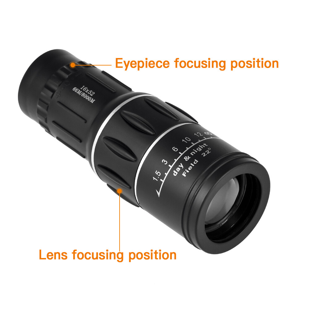 - This monocular offers a 16x magnification and a 52mm objective diameter.