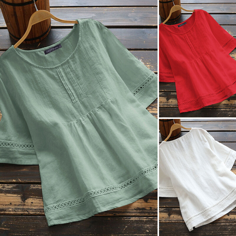 Fancystyle ZANZEA Women Shirt Half Sleeve Hollow Out Tops Blouse Crewneck Baggy Casual Plus