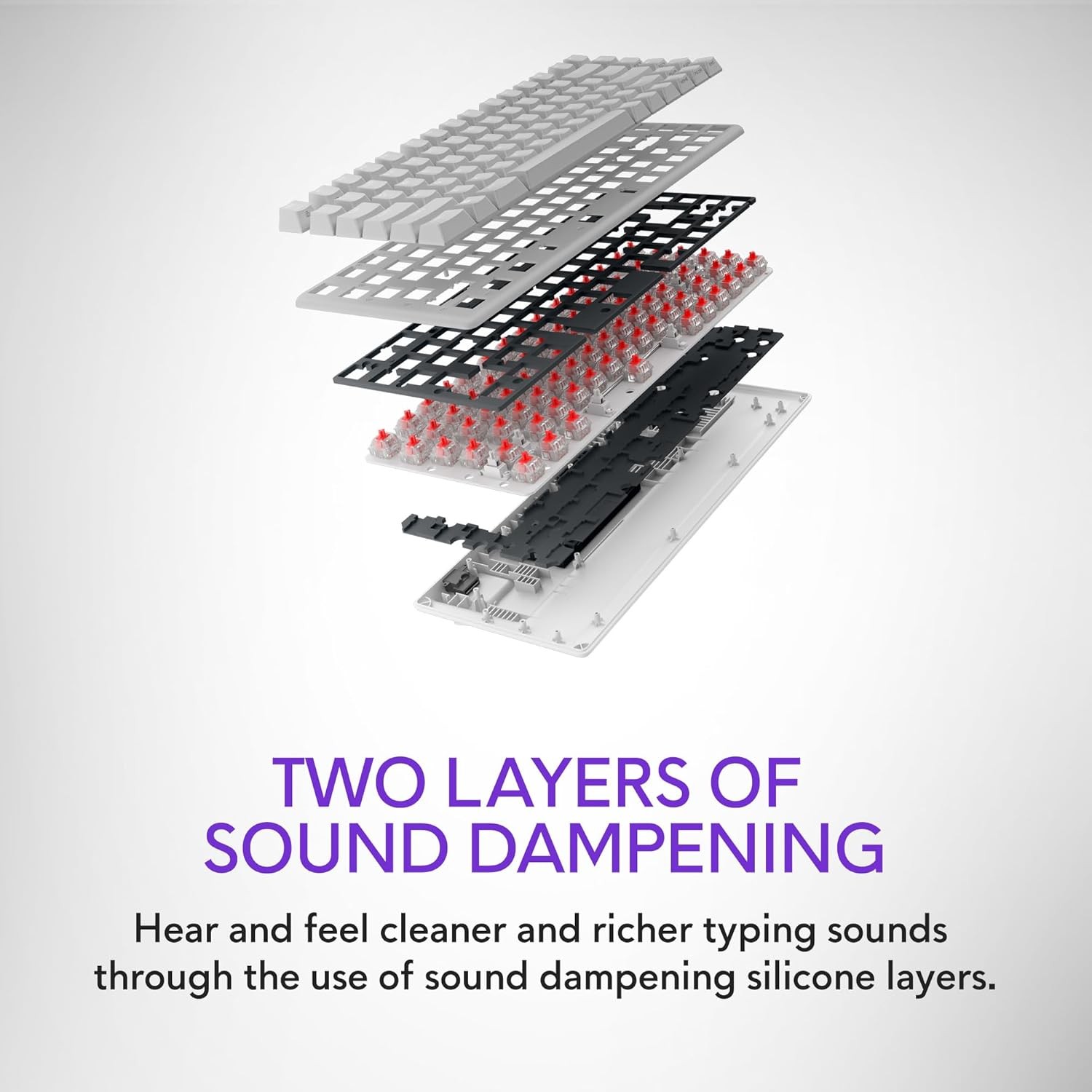 • Two layers of sound dampening: Hear and feel cleaner and richer typing sounds through the use of sound dampening silicone layers.
