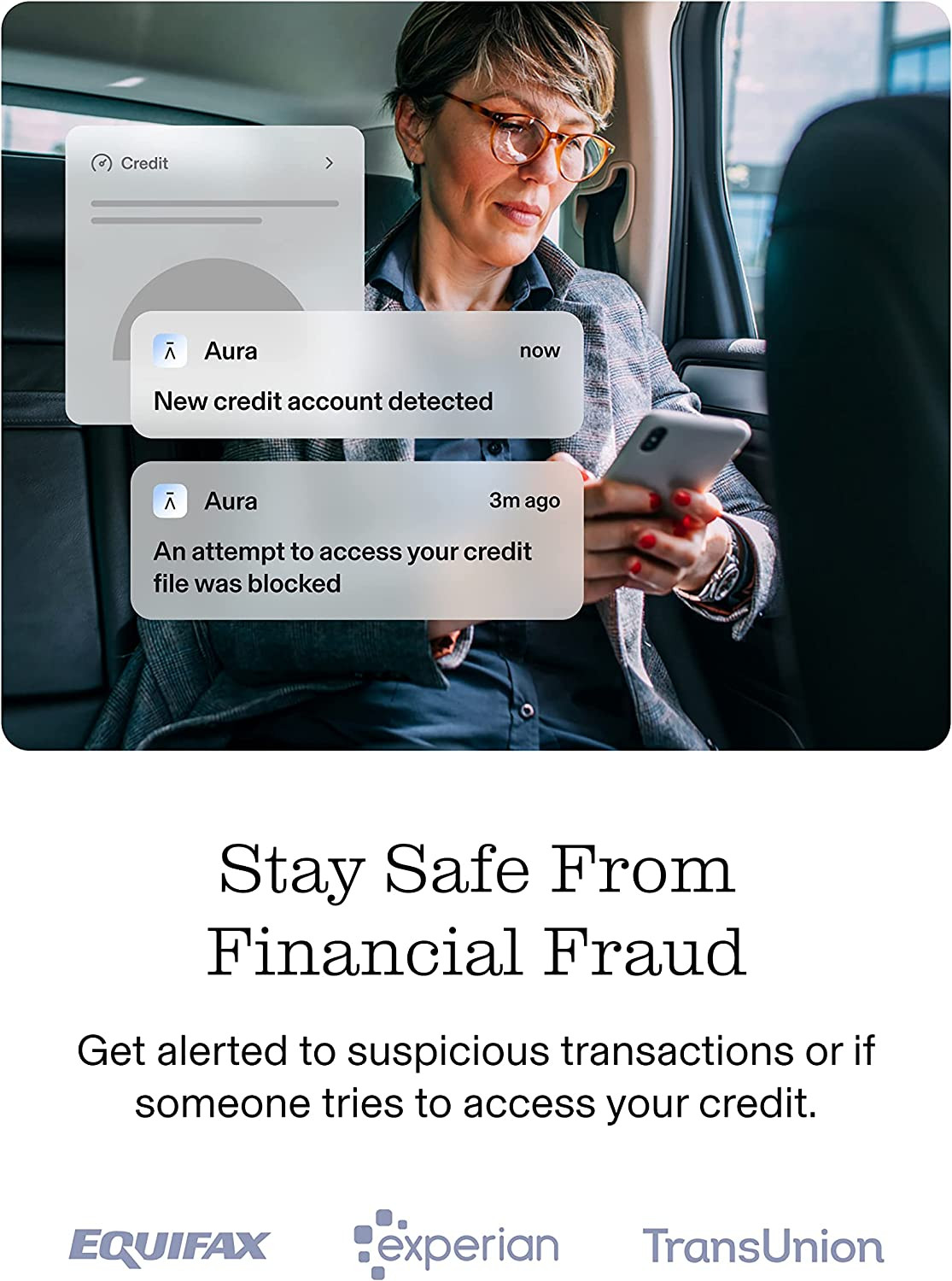 STAY SAFE FROM FINANCIAL FRAUD: Aura’s credit monitoring helps you prevent financial loss by monitoring banks accounts and credit files, and notifying you of fraud up to 250x faster than the competitors.*