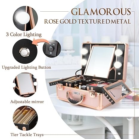 Kemier Makeup Train Case - Cosmetic Organizer Box Makeup Case with Lights and Mirror/Makeup Case with Customized Dividers/Large Makeup Artist Organizer Kit (Rose Gold)