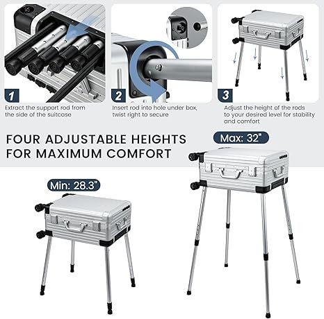 【FREE-STANDING WORKSTATION】- Durable telescopic legs can be positioned within the case and rotated to the right for immediate setup. By pressing and holding the metallic button while extending the legs, you can achieve four various heights from the ground to the base of the box, making it ideal for salon applications, showcasing in shopping malls, as well as for use by both home-based and freelance makeup artists, and for dance competitions. The bottom of the legs feature adjustable bowl-shaped feet to accommodate uneven floors.